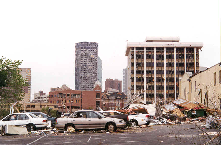 I was driving to Arlington from Dallas and was almost home, but when the rain became blinding and the radio announcer started with the "everyone take cover" talk, I pulled into a the drive-thru tunnel at Woody's Pawn Shop to wait it out. Truthfully, I probably would've been fucked had it come through there, but thankfully it veered elsewhere. That wasn't actually the one that hit downtown, it was another one that ripped up part of southern Arlington. Scared the bejeezus out of me, I'll tell you what.