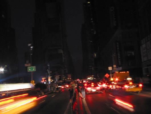 But none of us really knows what's going on yet. As far as we know, a transformer blew in downtown Brooklyn. However, Big Jimmy tells me that he was on a landline call to a guy at LaGuardia, who reported the power out there, too. It occurs to me to call Wifely. But it appears that my cellphone is kaput. It may sound silly now, but from a darkened office tower with a view of lower Manhattan, all of this was feeling pretty ominous.